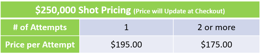 - One (1) player to take one (1) attempt at $250,000 (minimum yardage of 165 yards for men, 150 yards for women)