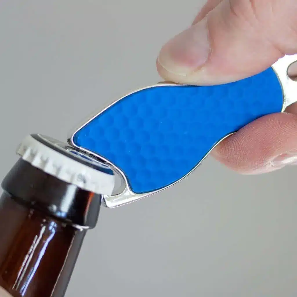 A golf tool every golfer will love. The contour divot repair tool features a sturdy die cast design with shiny nickel finish. The contoured handle with molded thumb rest provides superior leverage and control. A soft and colorful textured PVC grip handle is available in black, blue, red, green, or white PVC. Features an integrated bottle opener top and a 1″ removable golf ball marker with full color poly dome imprint. Perfect for golf tournaments and outings.