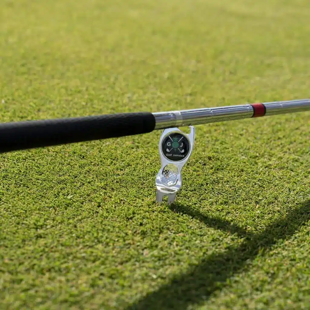 - Sturdy die cast golf tool with ergonomic, contoured PVC grip