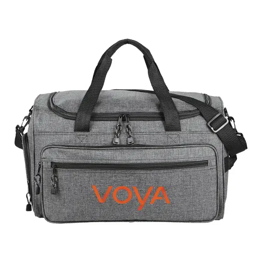 This custom duffel bag includes a zippered end pocket, perfect for shoes, and a gusseted front pocket. The Excel Sport Club Duffel Bag includes a detachable, adjustable shoulder strap.