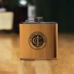 | Laser engraved with your event or sponsor logo, stainless steel flask, 4.25″h; 6 oz..