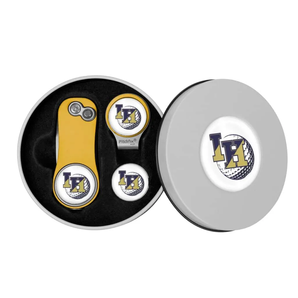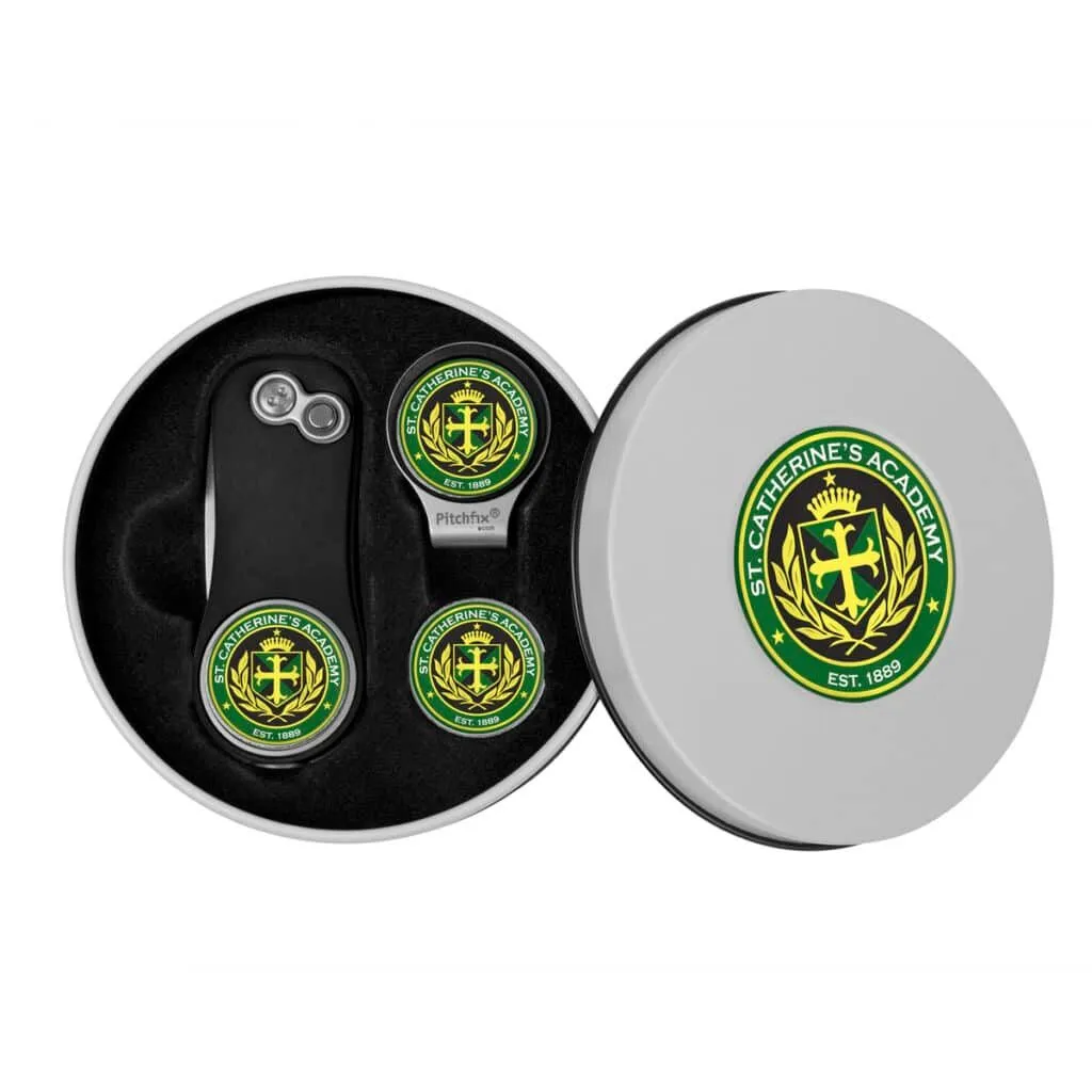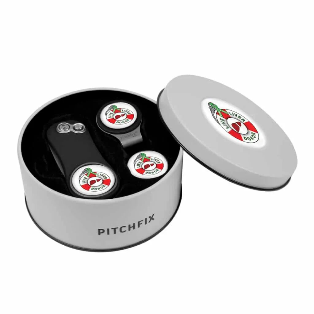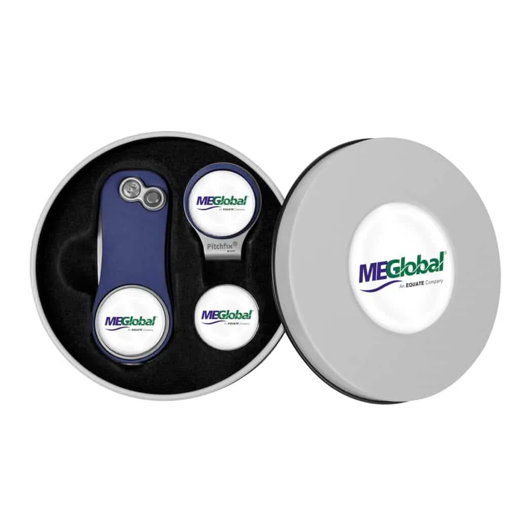 Deluxe Gift Set with Hat Clip includes vintage round metal tin, Pitchfix Golf Hat Clip with full color ball marker, and an extra full color ball marker.